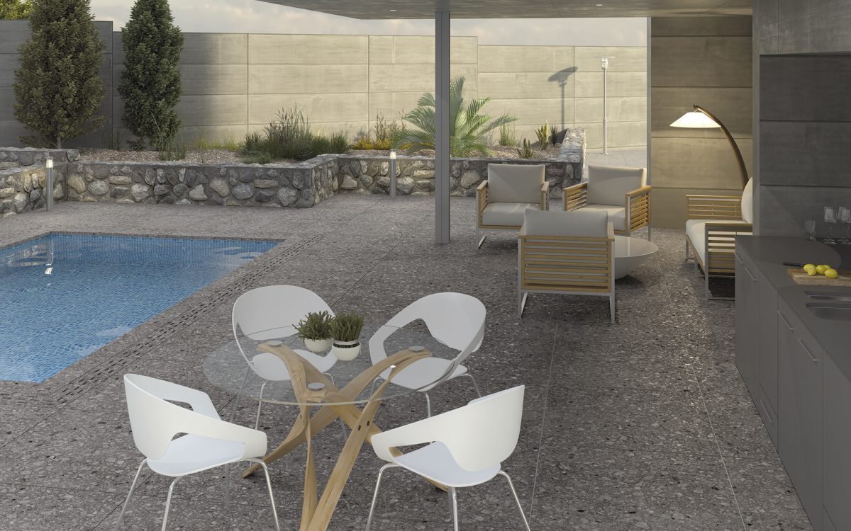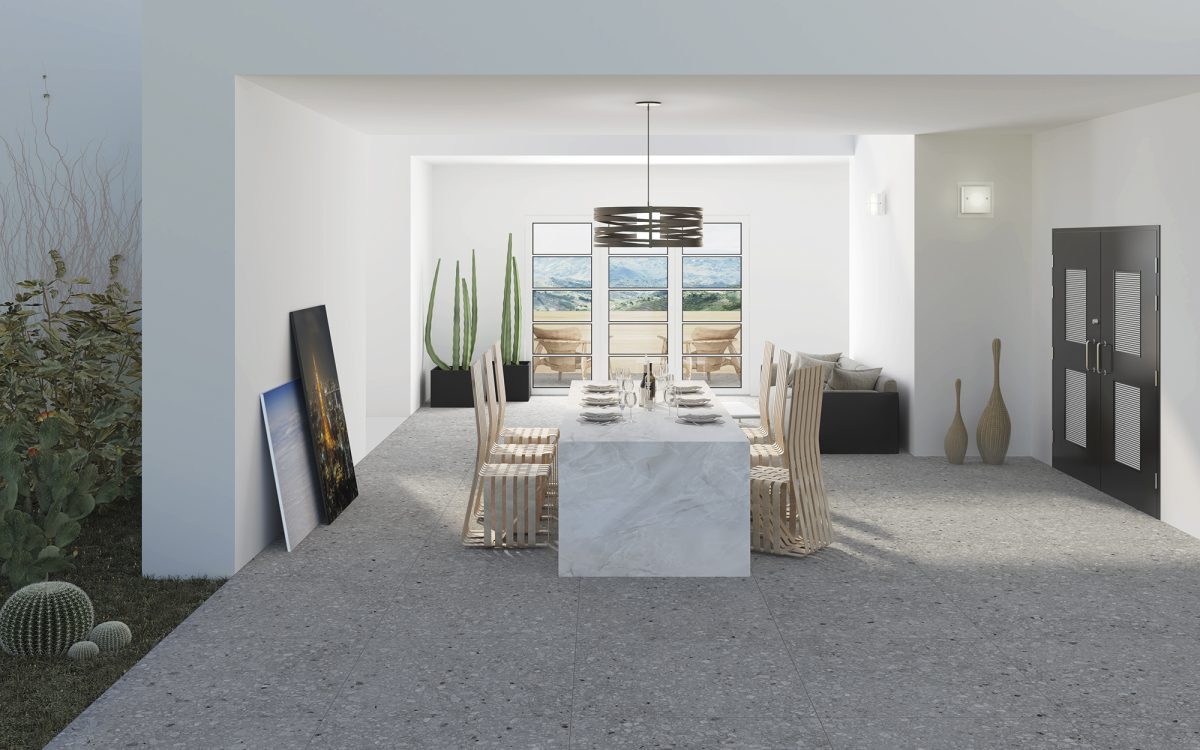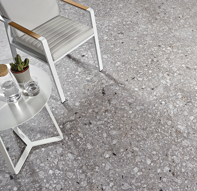 Son mélange méticuleux de pierres différentes et exclusives permet d’obtenir une nouvelle surface avec un air minimaliste capable d’intégrer les espaces intérieurs et extérieurs.